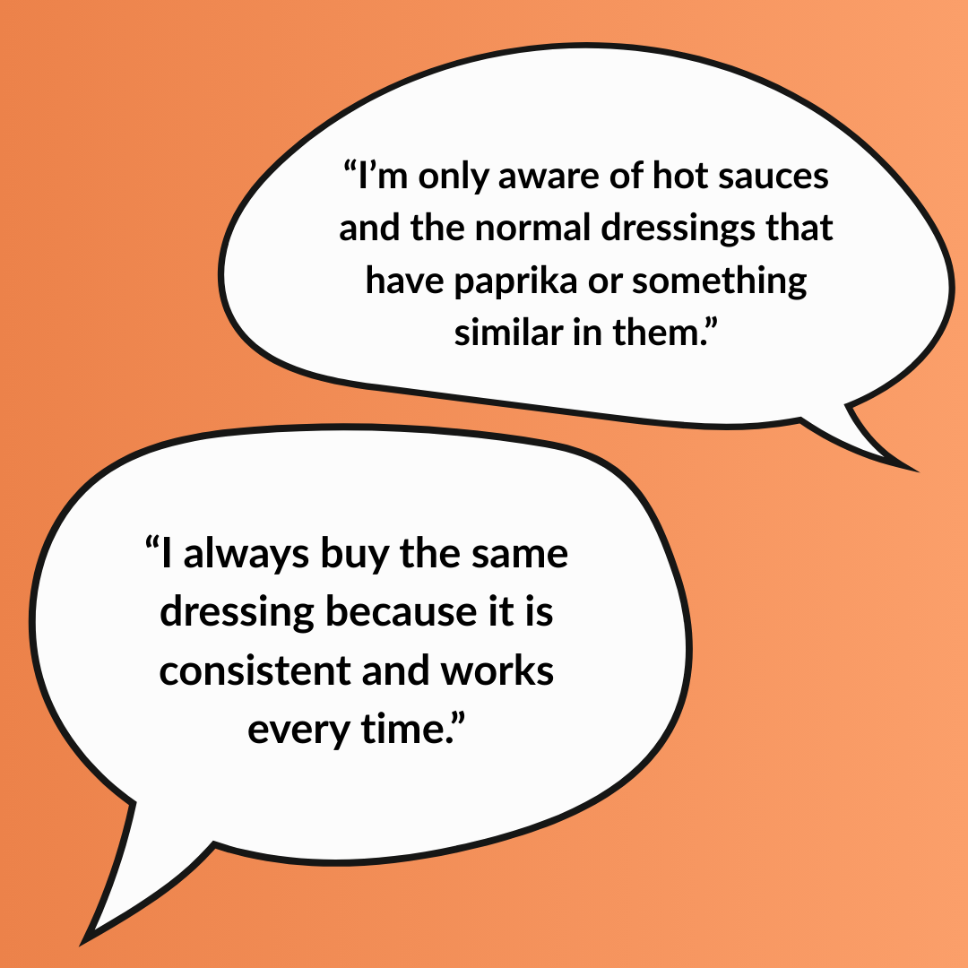 When consulting people through interviews and a survey, we found that there are a lot of people who can’t stand the burn of spicy items. They feel annoyed by the heat of dressings they try, and therefore desire an alternative option.